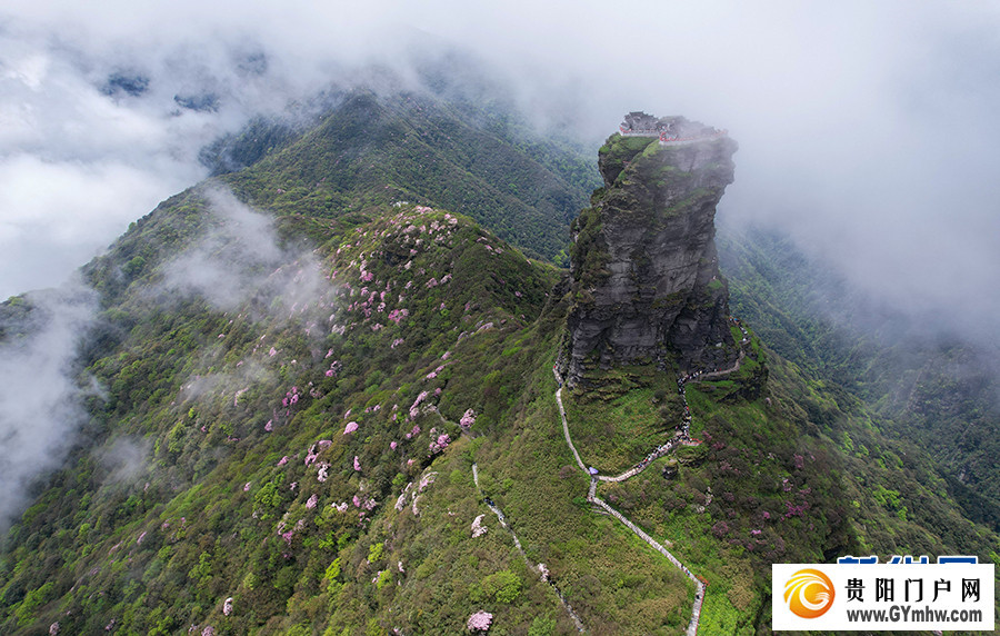 5月5日,游客在世界自然遗产地梵净山景区观赏杜鹃花美景。新华网发(李鹤 摄)