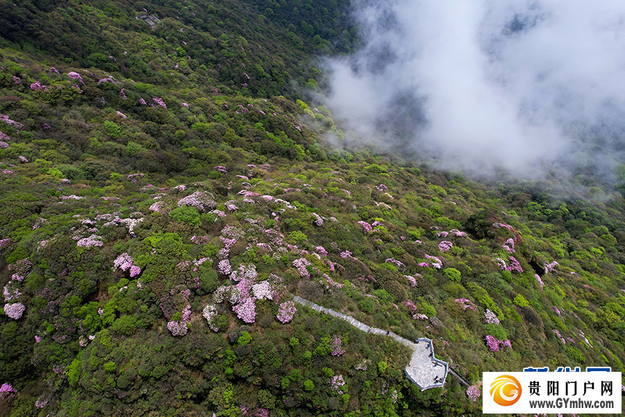 5月5日,俯瞰世界自然遗产地梵净山景区杜鹃花海美景。新华网发(李鹤 摄)